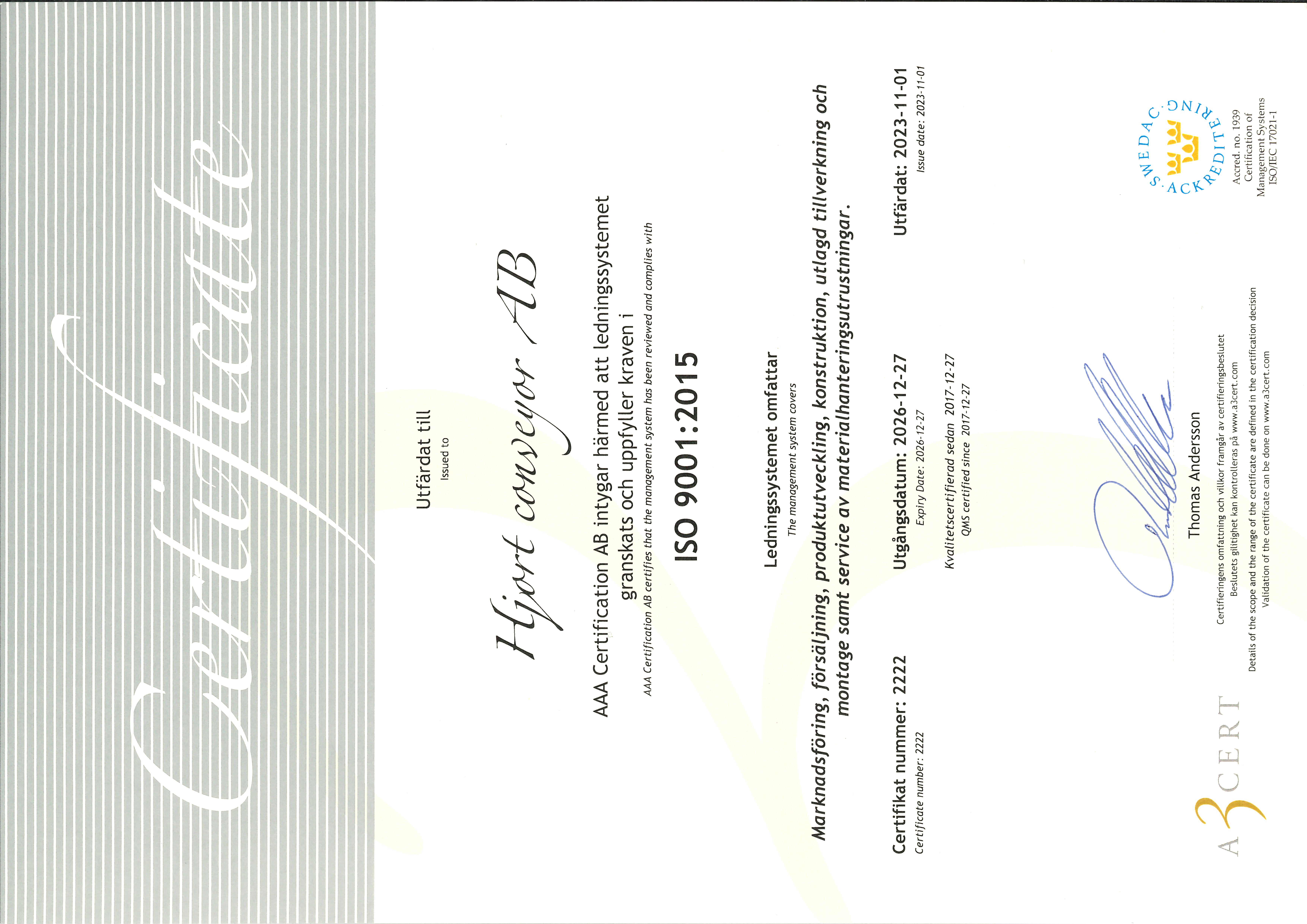 Hjort-conveyor AB skall leverera varor och tjänster som överenstämmer med kundernas krav, behov och förväntningar.