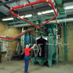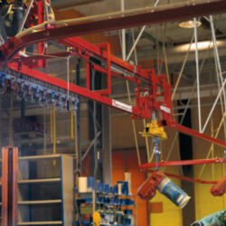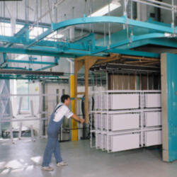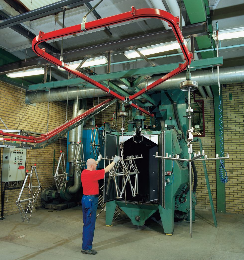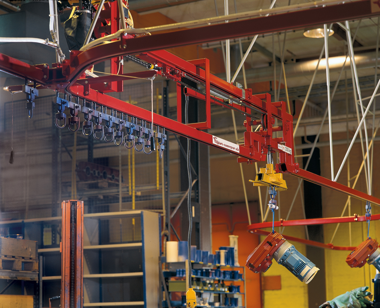 Hängbana serie 500 är för laster upp till 500 kg. Lasterna flyttas manuellt eller genom självrullning i lutande bana. Vid nivåskillnader eller längretransportsträckor kan systemet förses med drivanordningar.